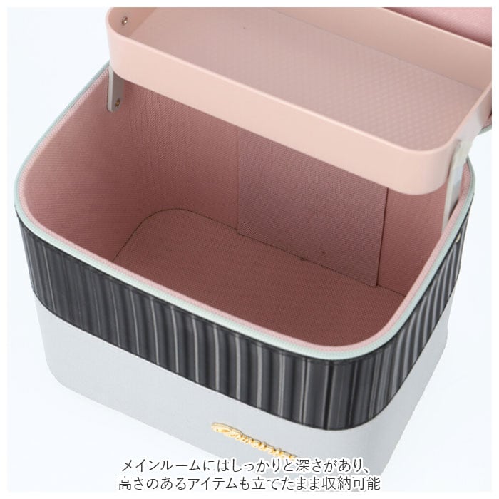 ・開口部のダブルファスナーを開放すると、長方形のコスメトレーがボックス奥に向けてスライドオープンする仕組み。