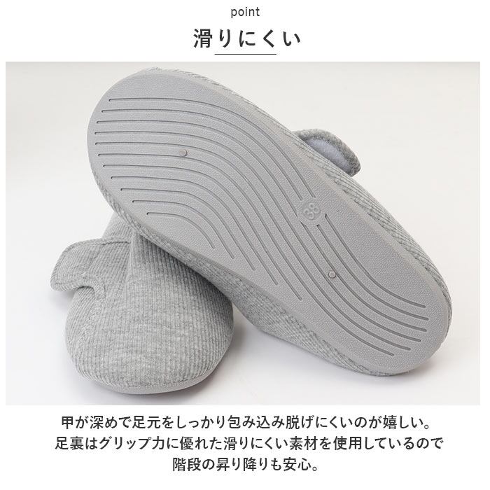 ・甲が深めで足元をしっかり包み込み脱げにくいのが嬉しい。足裏はグリップ力に優れた滑りにくい素材を使用しているので、階段の昇り降りも安心。