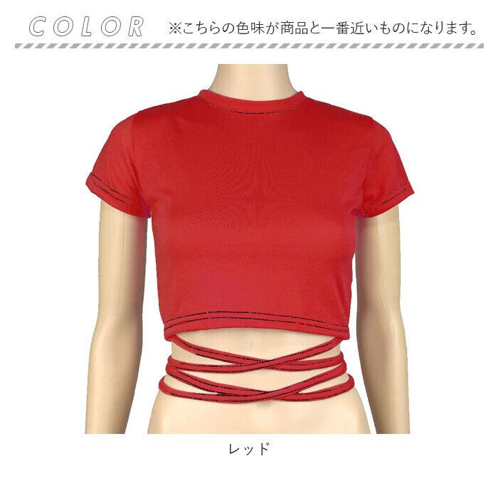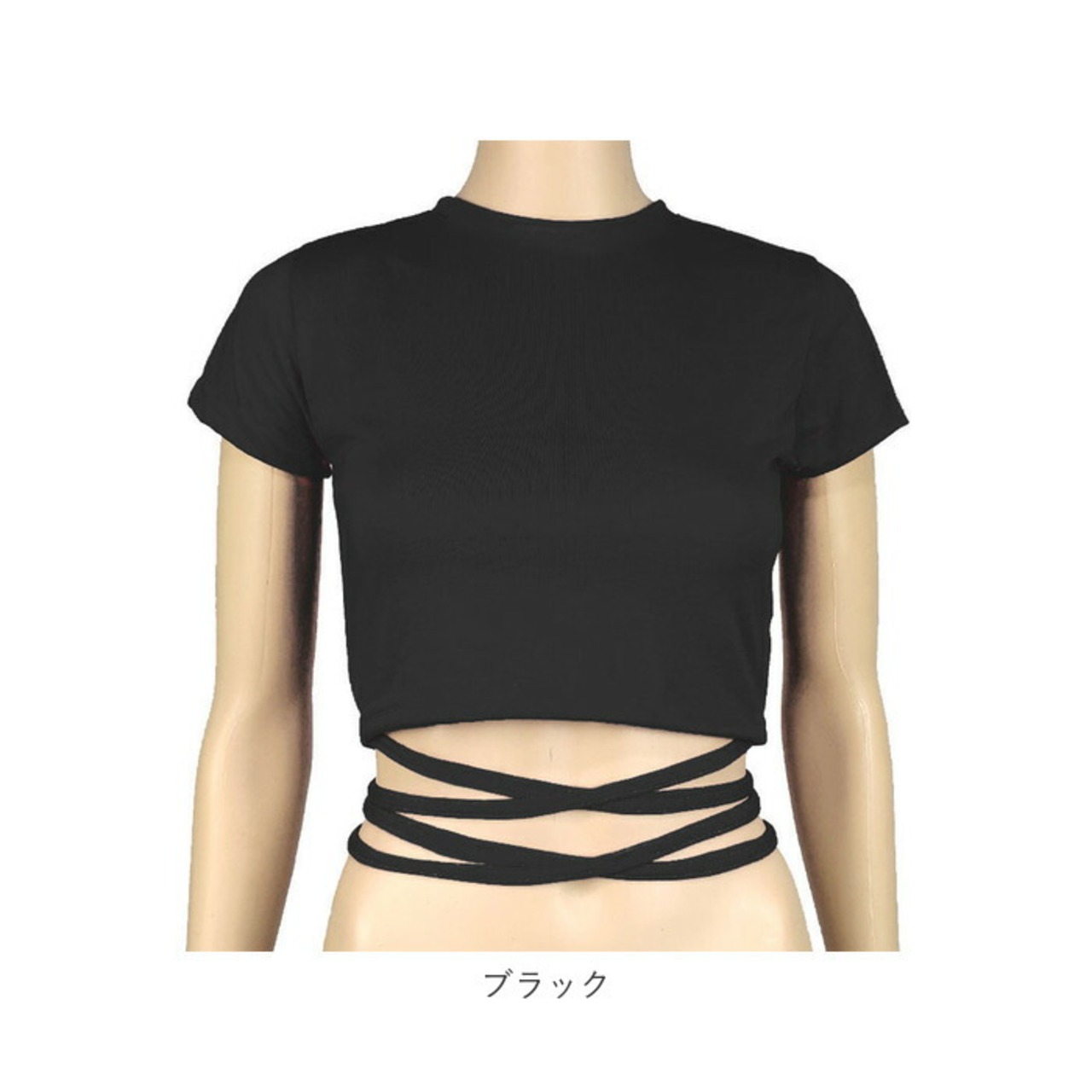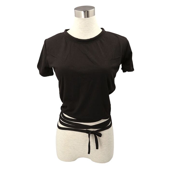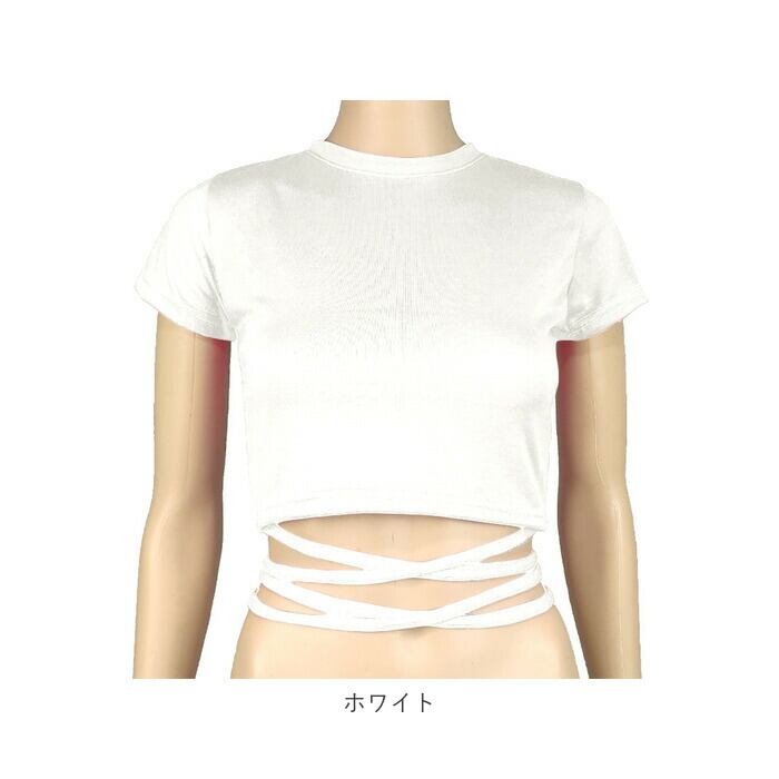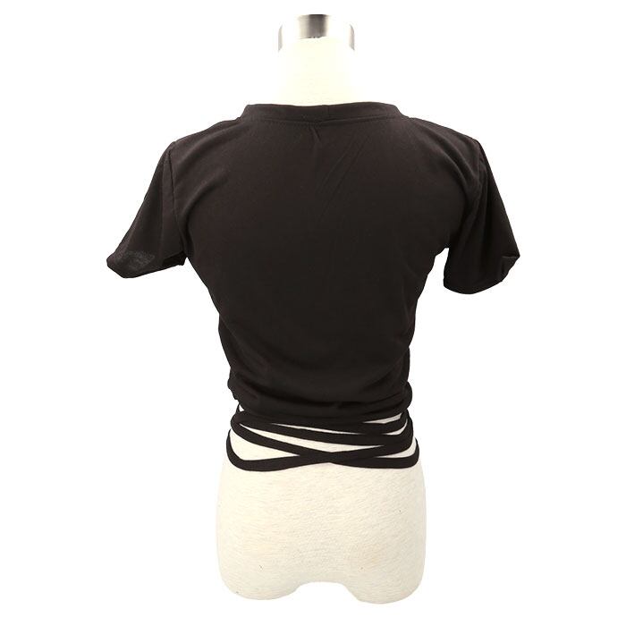 ・ウエストをリボンでクロスするショート丈のデザインTシャツ。
