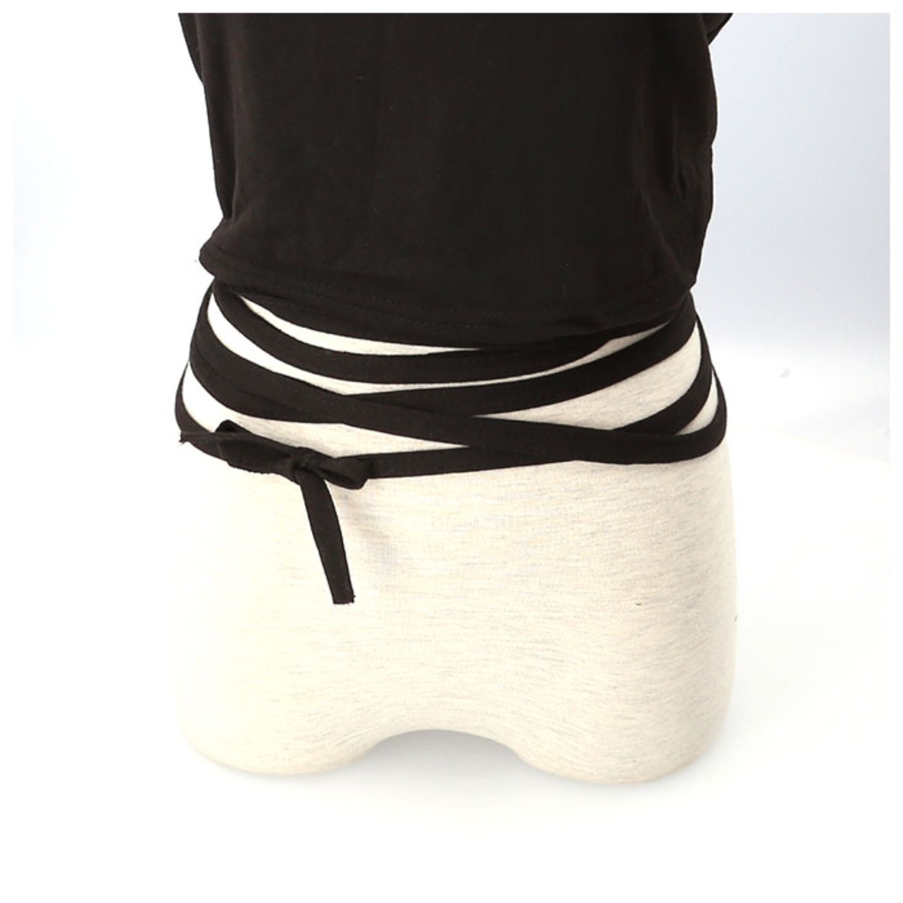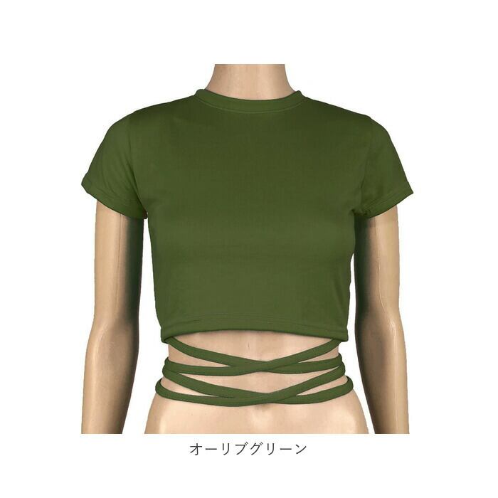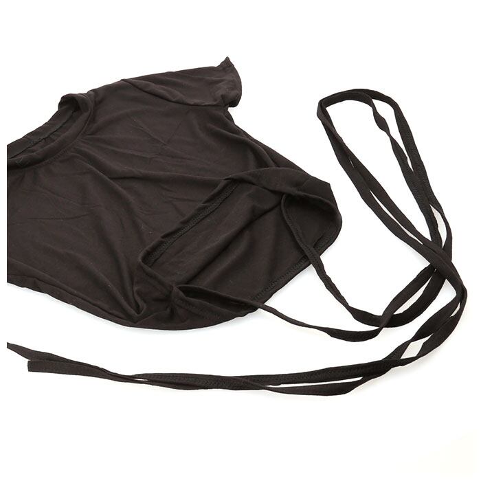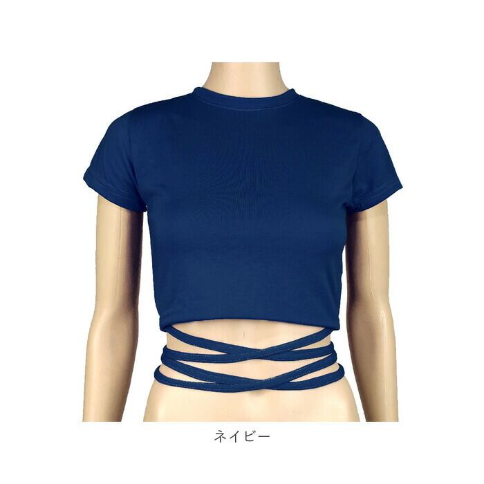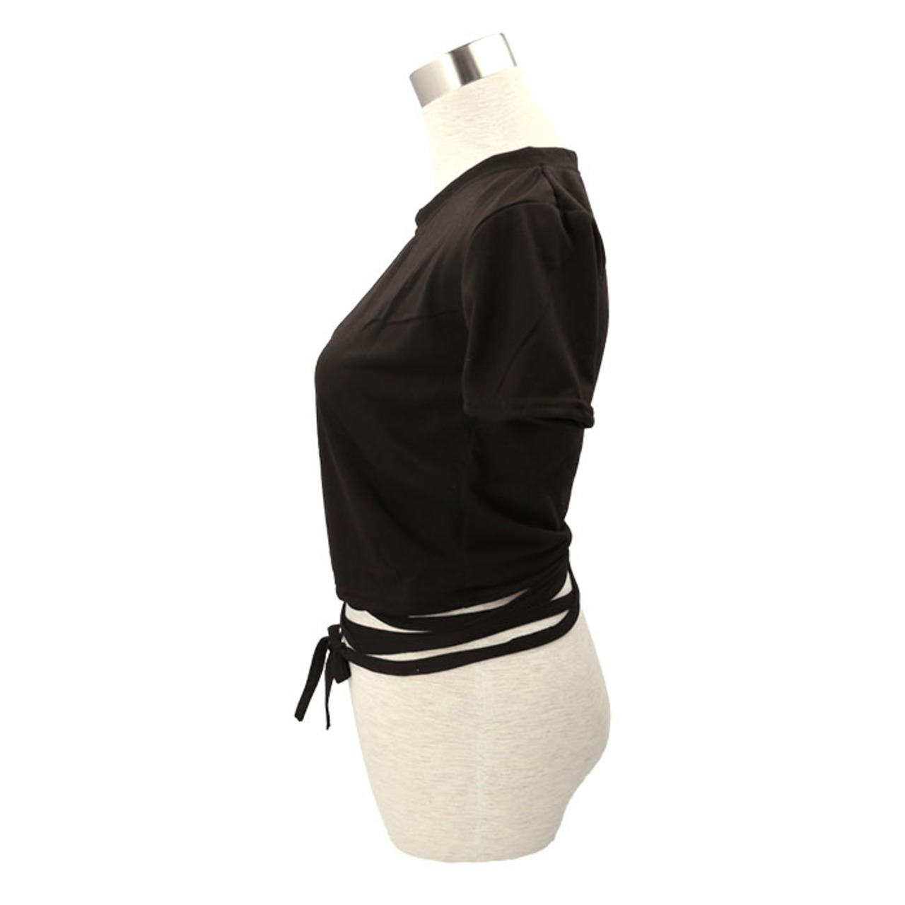 ・ウエストをリボンでクロスするショート丈のデザインTシャツ。