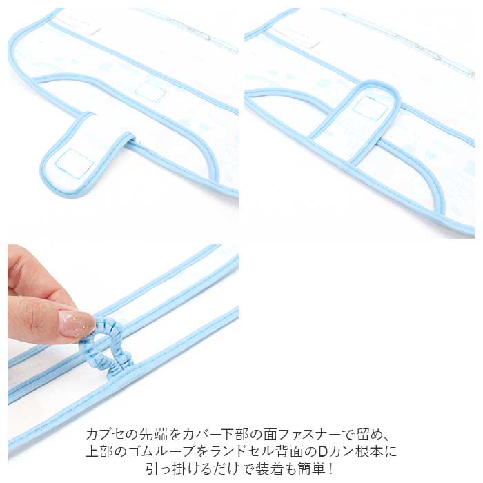 ・カブセの先端をカバー下部の面ファスナーで留め、上部のゴムループをランドセル背面のDカン根本に引っ掛けるだけで装着も簡単!