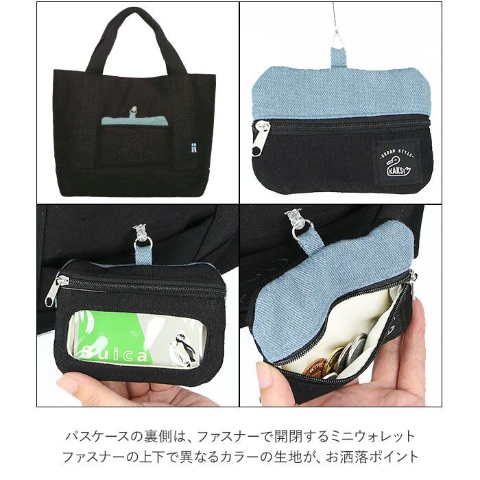 ・パスケースの裏側はファスナーで開閉するミニウォレット。ファスナーの上下で生地のカラーを切り替えているところが、お洒落ポイント。
