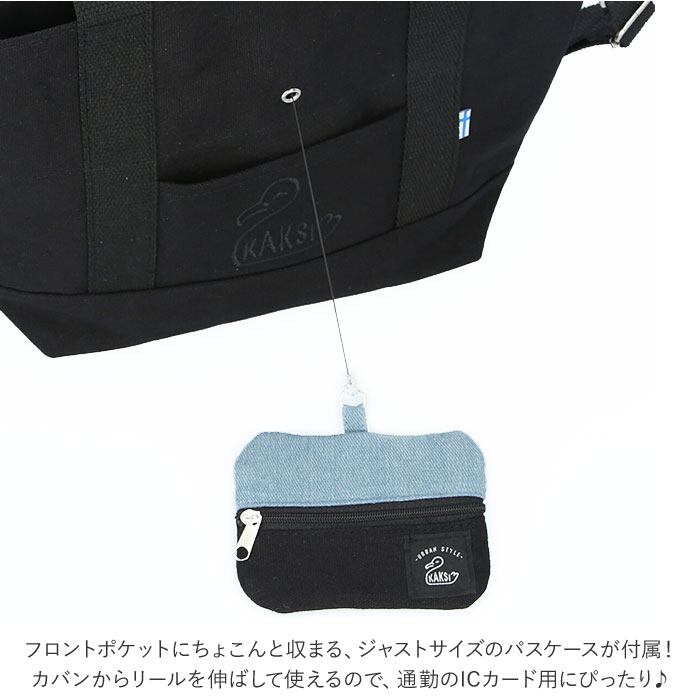 ・フロントポケットにちょこんと収まる、ジャストサイズのパスケースが付属!カバン本体からリールでぐ〜んと伸ばして使えるので、改札口はスマートにタッチ&スルー。パスケースの紛失防止にも♪