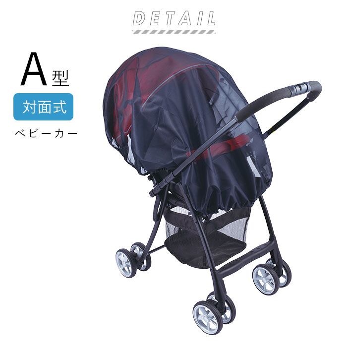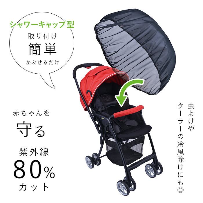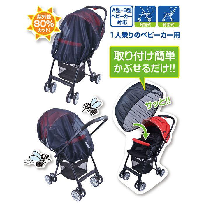 ベビーカーにサッとかぶせるだけで簡単に取り付けができる日よけ虫よけカバー。A型・B型(対面式・背面式)の1人乗りベビーカーに対応。