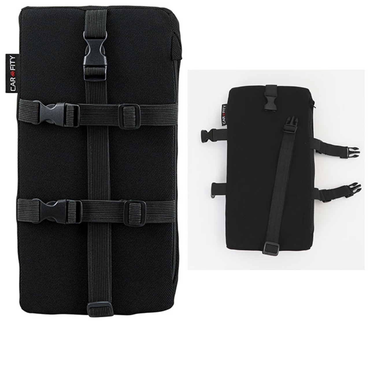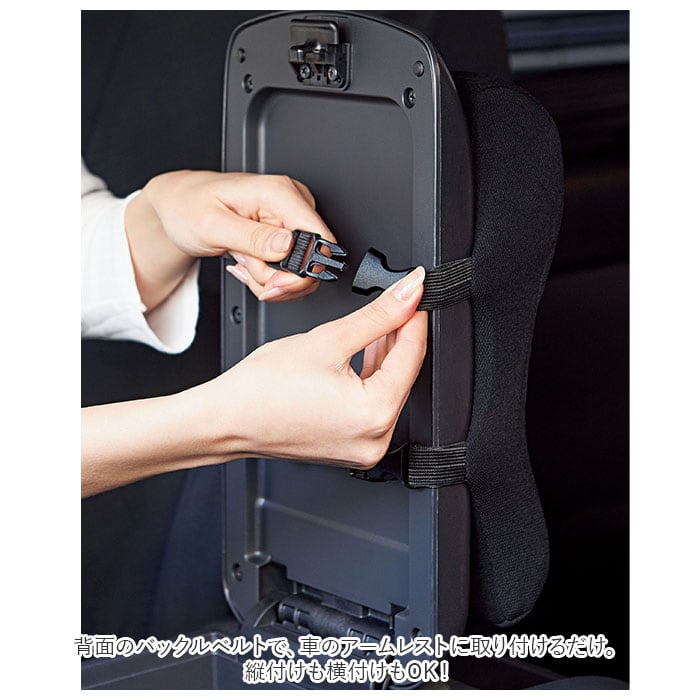 ・背面のバックルベルトで、車のアームレストに取り付けるだけ。縦付けも横付けもOK!