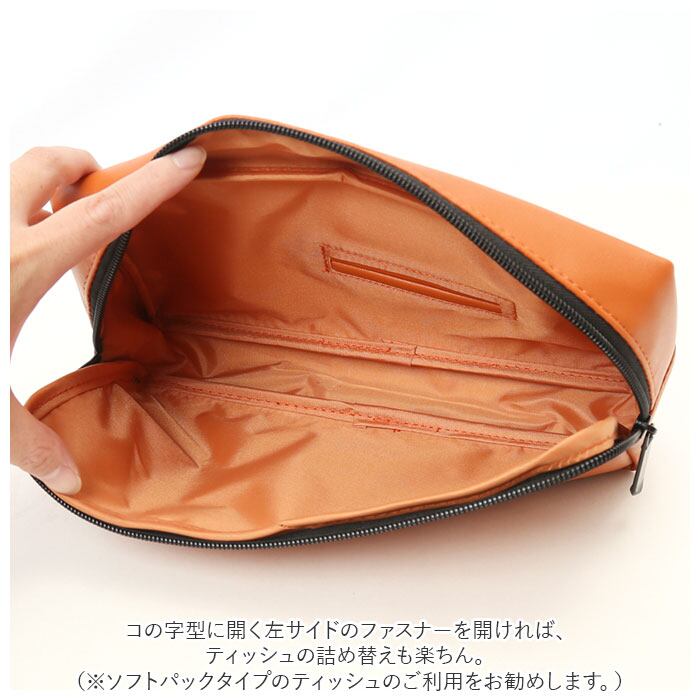 ・コの字型に開く左サイドのファスナーを開ければ、ティッシュの詰め替えも楽ちん。(※ボックスタイプのティッシュはそのまま収納できません。箱から詰め替えてご使用になるか、ソフトパックタイプのティッシュのご利用をお勧めします。)