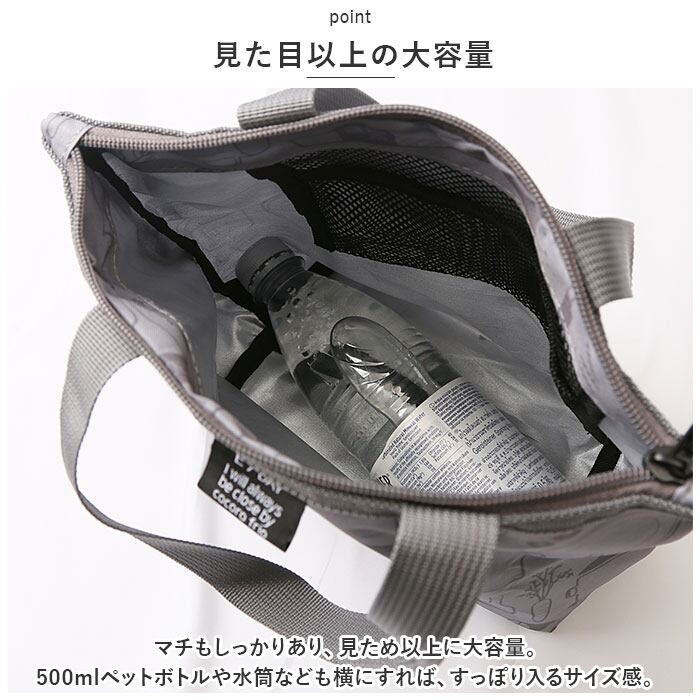 ・マチもしっかりあり、見ため以上に大容量。500mlペットボトルや水筒なども横にすれば、すっぽり入るサイズ感。