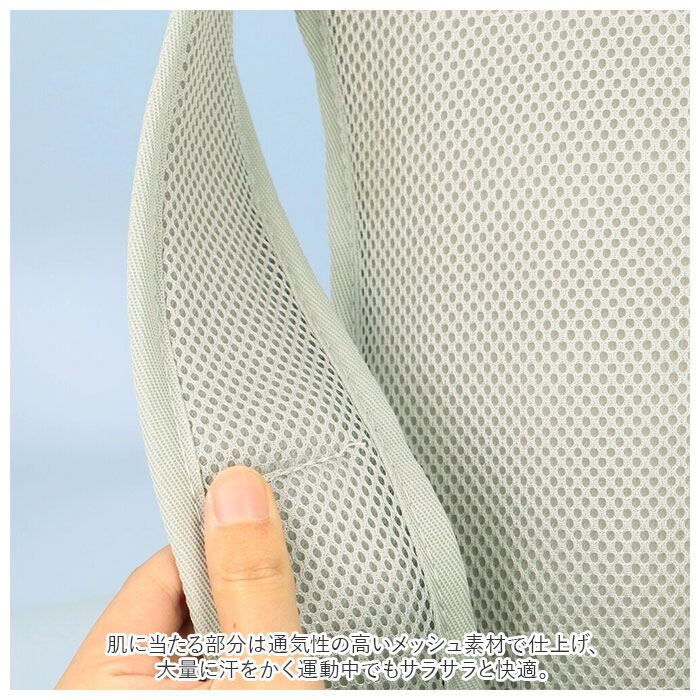 ・ショルダーや背中など、肌に当たる部分は通気性の高いメッシュ素材で仕上げ、大量に汗をかく運動中でもサラサラと快適。