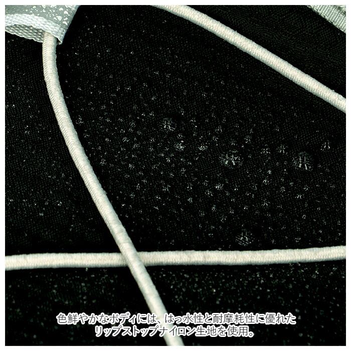 ・色鮮やかなボディには、はっ水性と耐摩耗性に優れたリップストップナイロン生地を使用。ドローコードのループやフロント下部のピッケルホルダーにはリフレクター素材を使用しているため、夜間のトレーニングでも安心。