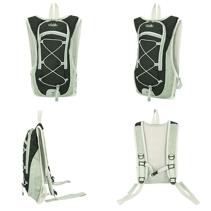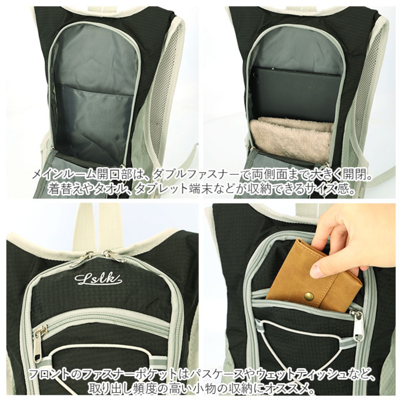 ・フロントのファスナーポケットはパスケースやウェットティッシュなど、取り出し頻度の高い小物の収納にオススメ。クロスさせたドローコードにはトレッキングポールを固定してもOK!