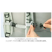 ・バックル式のチェストストラップが、ショルダーベルトの肩からのズレ落ちを防いで安定感も抜群。