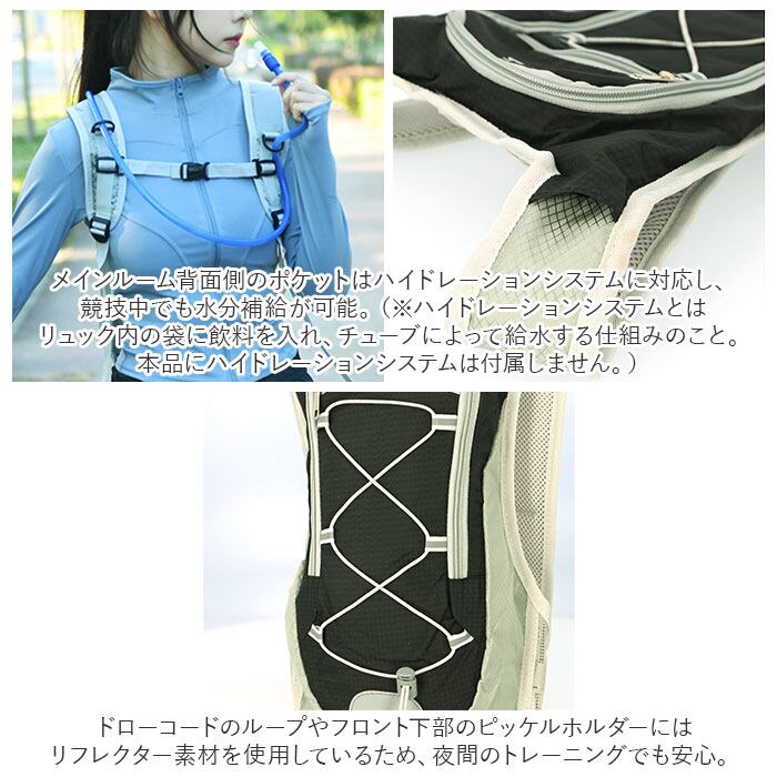 ・メインルーム背面側のポケットはハイドレーションシステムに対応し、トレイルランなどの競技中でも両肩の給水ホース穴から水分補給が可能。(※ハイドレーションシステムとはリュックサック内の袋に飲料を入れ、左右の肩から口許までのびるチューブによって給水する仕組みのこと。本品にハイドレーションシステムは付属しません。)