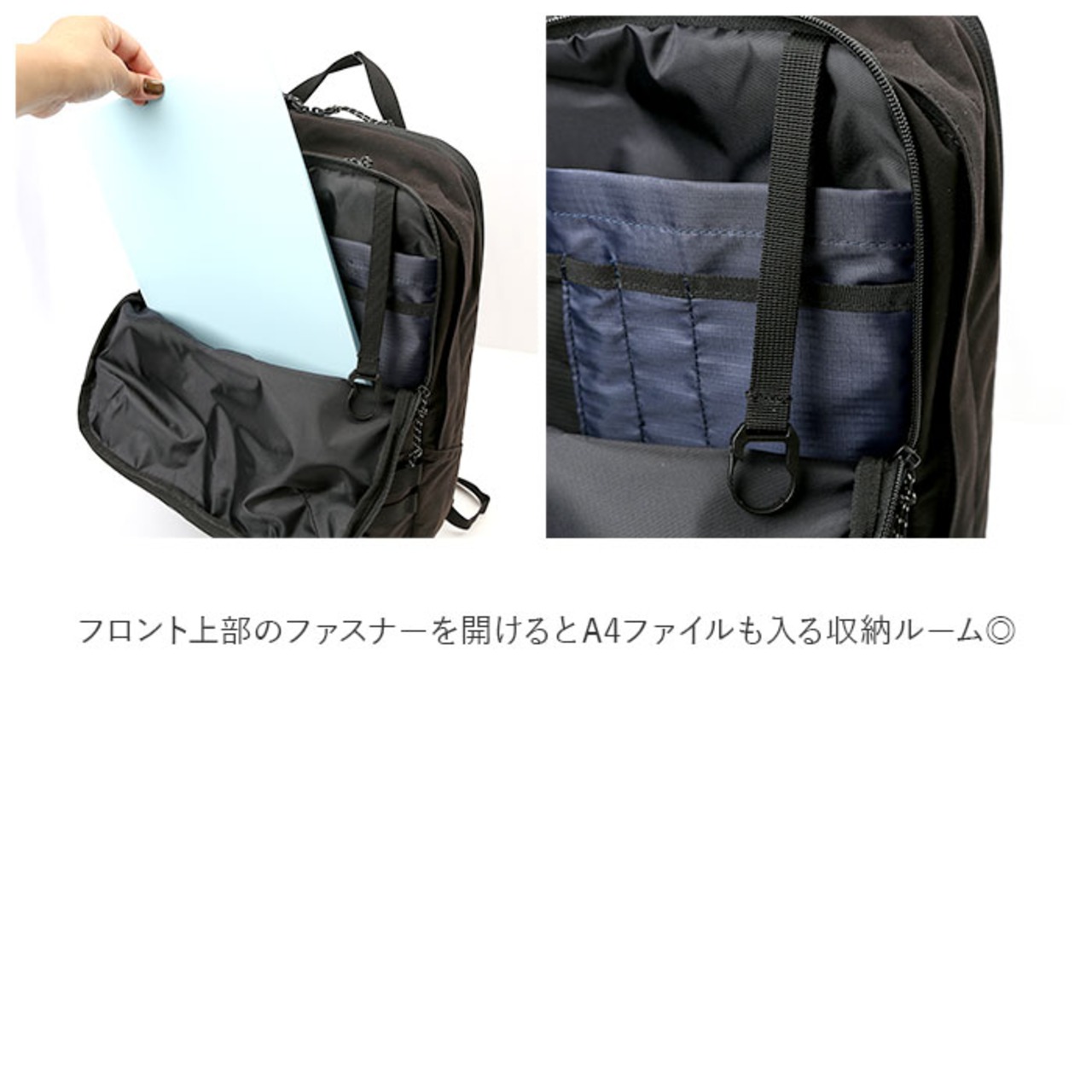 ・フロント上部のファスナーを開けるとA4ファイルも入る収納ルーム◎