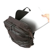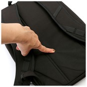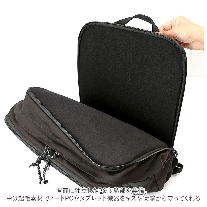 ・背面に独立したPC収納部を装備。中は起毛素材でノートPCやタブレット機器をキズや衝撃から守ってくれる。