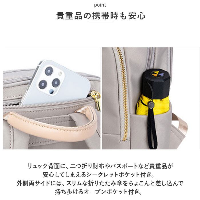 ・リュック背面に、二つ折り財布やパスポートなど貴重品が安心してしまえるシークレットポケット付き。