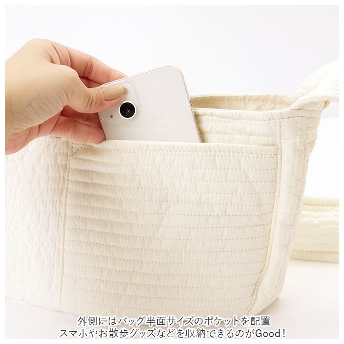 ・外側にはバッグ半面サイズのポケットを配置。スマホやお散歩グッズなどを収納できるのがGood!