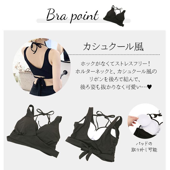 ・カシュクール風のブラはホックのないタイプで締め付け感なし!ホルターネックとバックのリボン結びでサイズの微調整も可能。取り外しできるパッド付き。
