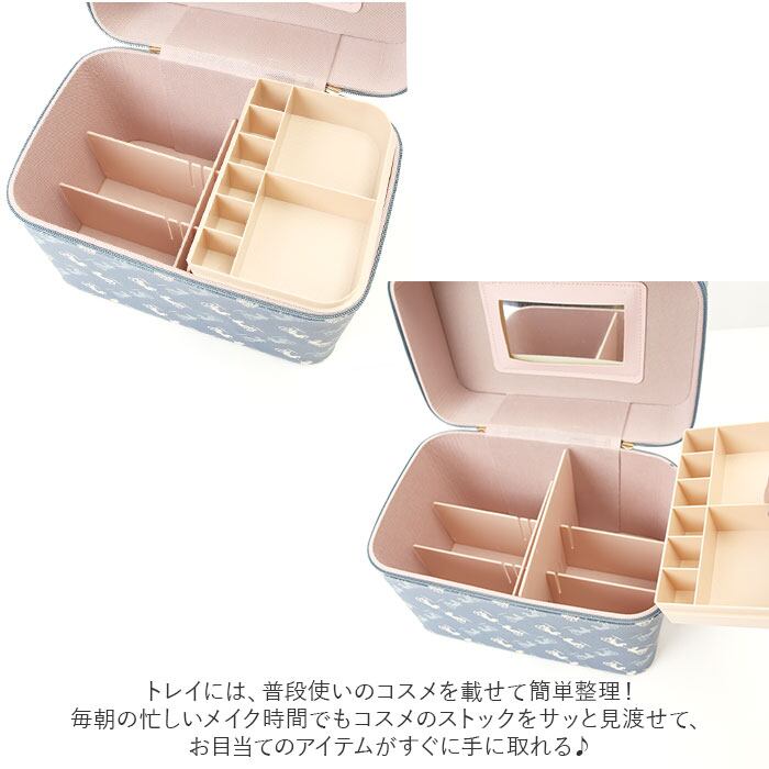 ・開口部フタは大きく開くダブルファスナー式。フタ裏には便利なミラー付きなので、一人暮らしのお部屋でも、このコスメボックスを広げればどこでもドレッサーに早変わり!