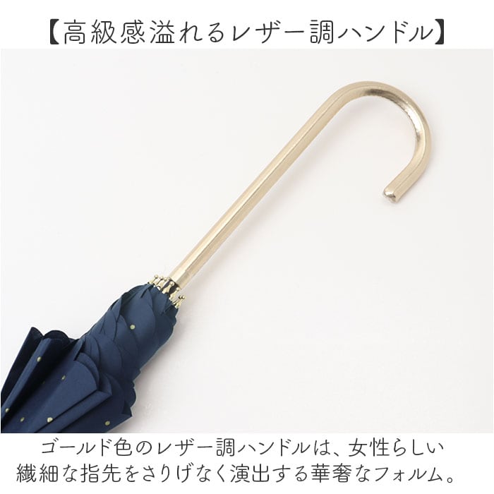 ・ゴールド色のレザー調ハンドルは、女性らしい繊細な指先をさりげなく演出する華奢なフォルム。