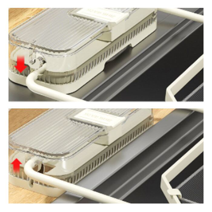 ・スチールフレームを回転させ、90度垂直に立てると省スペースに。食器洗い時はシンクがひろびろ!