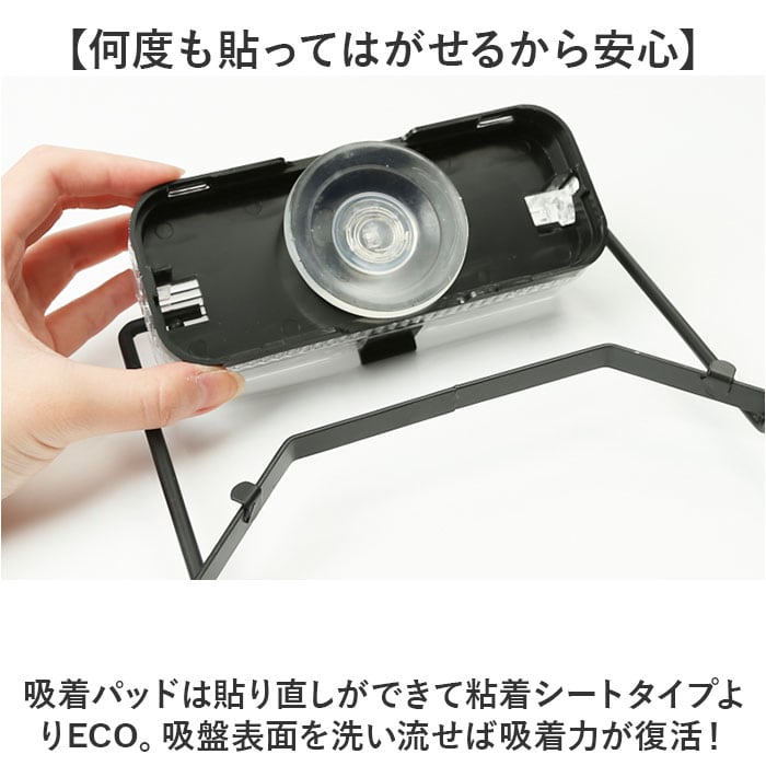 ・吸着パッドは貼り直しができて粘着シートタイプよりECO。吸盤表面を洗い流せば吸着力が復活!