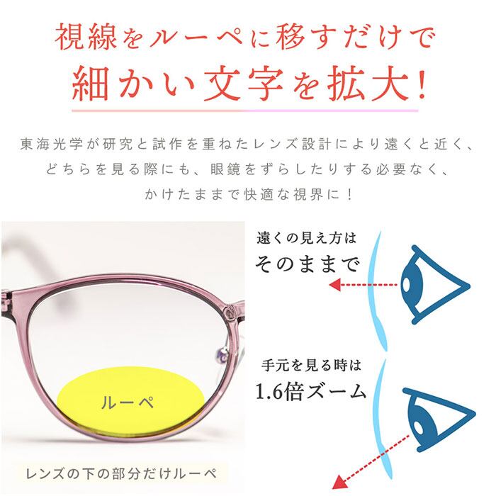 ・レンズの下部に目立ちにくい約1.62倍のルーペを採用。視線を下に向けるだけで手元がクリアに。