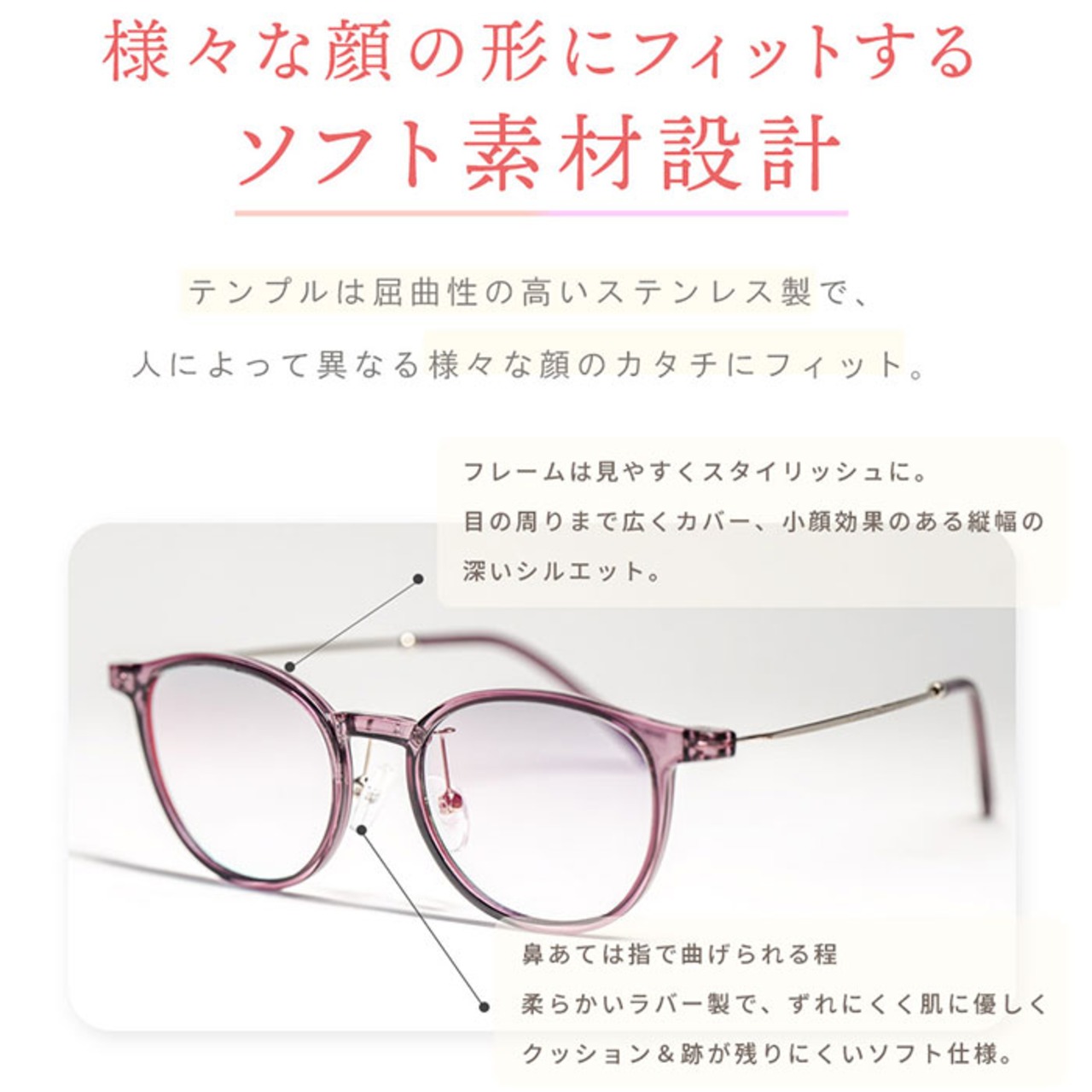 ・鼻跡が付きにくいしなやかなクリングスと顔の輪郭に添うフレーム構造で、驚くほどのフィット感。