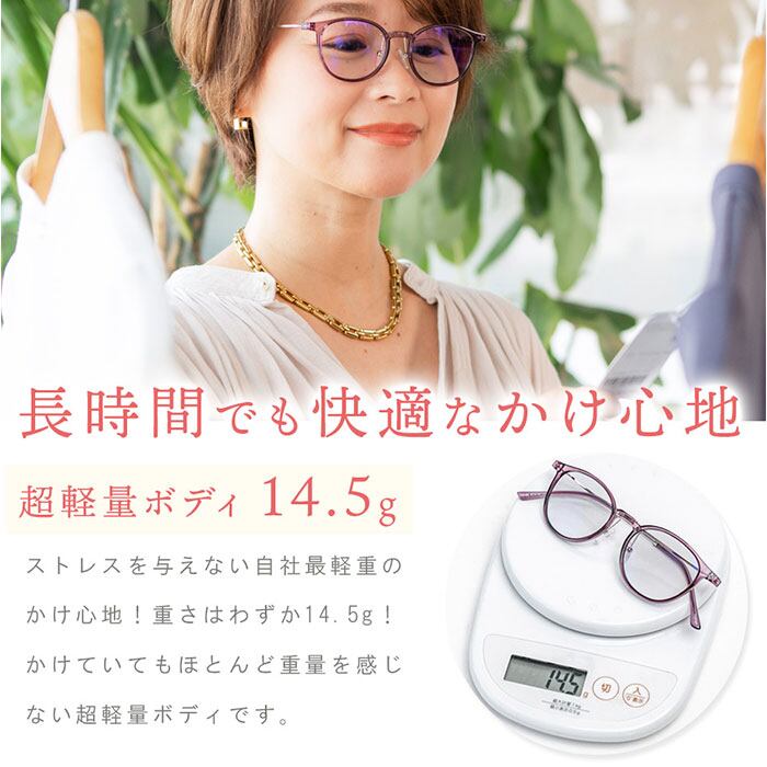 ・掛けていてもほとんど重さを感じさせない約14.5gの超軽量ボディで、ふんわり快適な掛け心地。