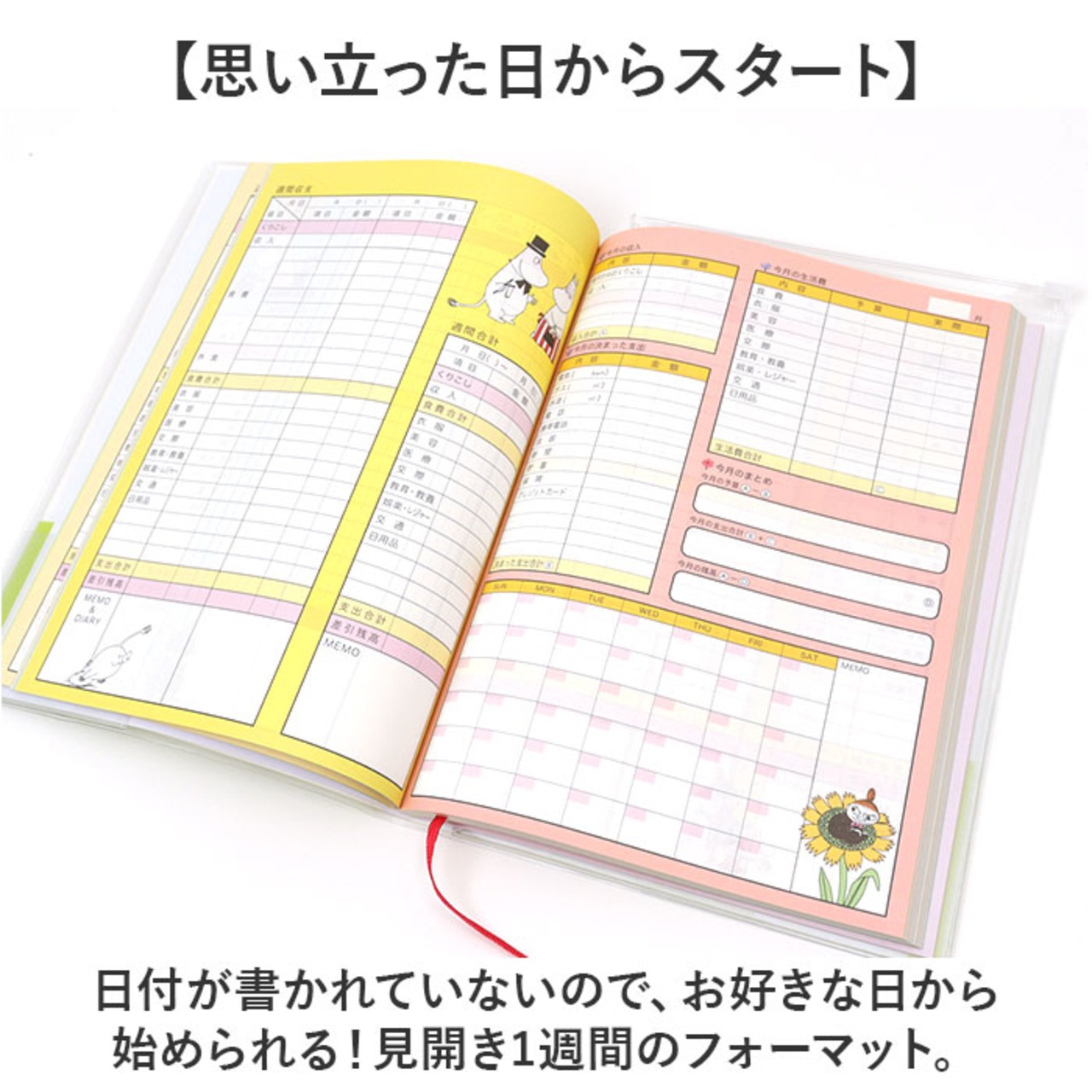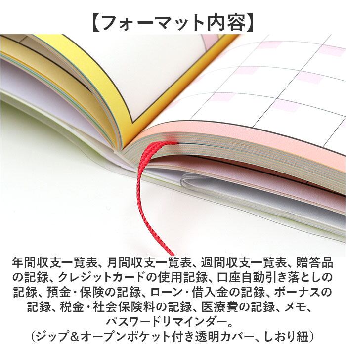 ・年間収支一覧表、月間収支一覧表、週間収支一覧表、贈答品の記録、クレジットカードの使用記録、口座自動引き落としの記録、預金・保険の記録、ローン・借入金の記録、ボーナスの記録、税金・社会保険料の記録、医療費の記録、メモ、パスワードリマインダー。(ジップ&オープンポケット付き透明カバー、しおり紐)