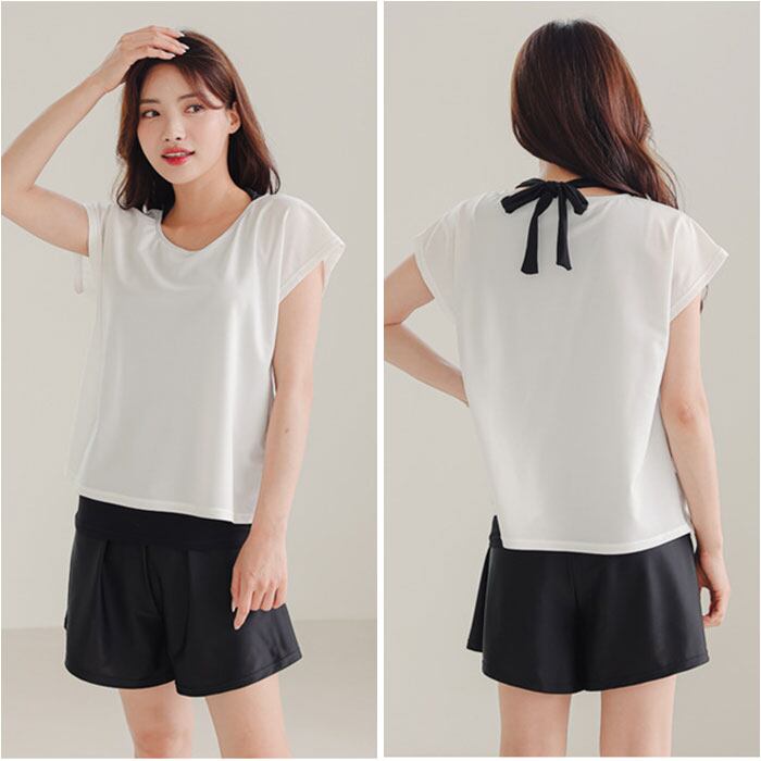 ・半袖とショートパンツの上下セット。露出を控えた作りなので、フィットネスもOK!