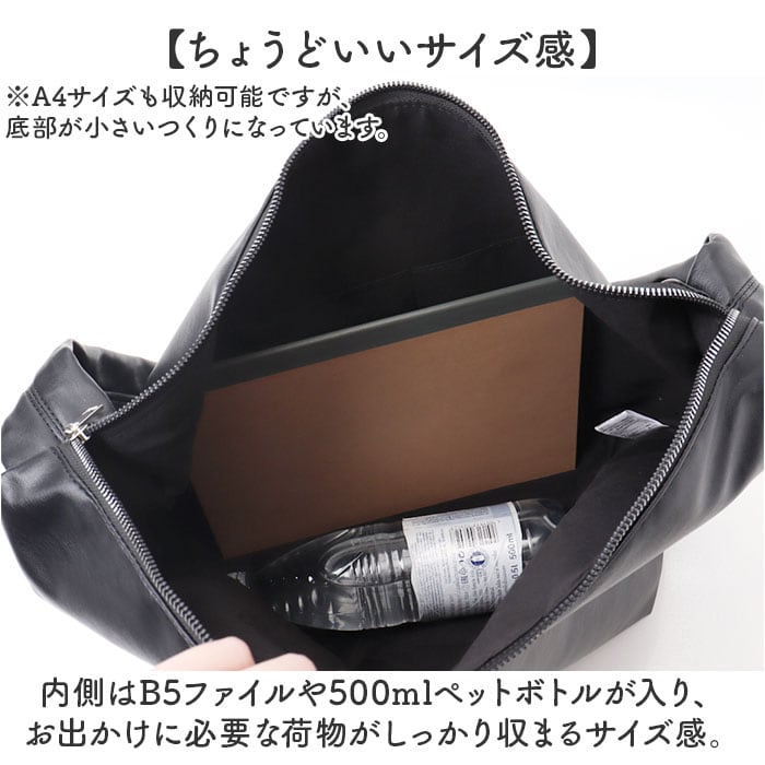 ・内側はB5ファイルや500mlペットボトルが入り、お出かけに必要な荷物がしっかり収まるサイズ感。