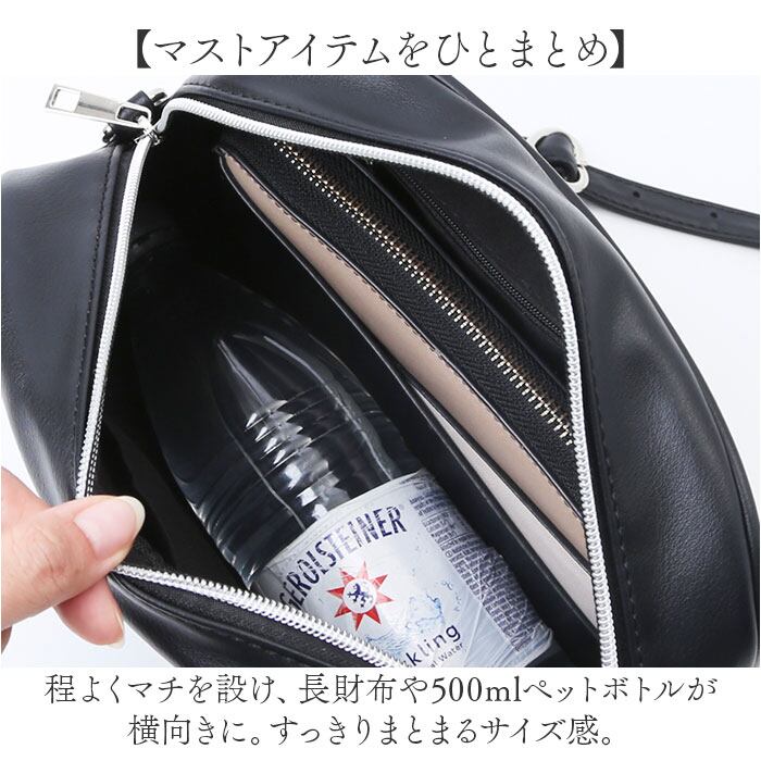 ・程よくマチを設け、長財布や500mlペットボトルが横向きに。すっきりまとまるサイズ感。