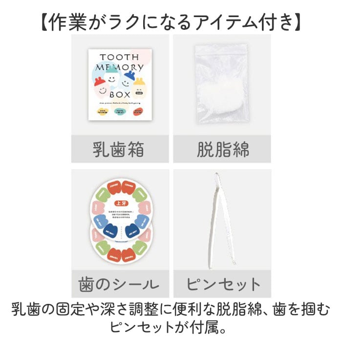 ・乳歯の固定や深さ調整に便利な脱脂綿、歯を掴むピンセットが付属。