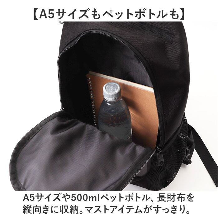 ・A5サイズや500mlペットボトル、長財布を縦向きに収納。マストアイテムがすっきり。