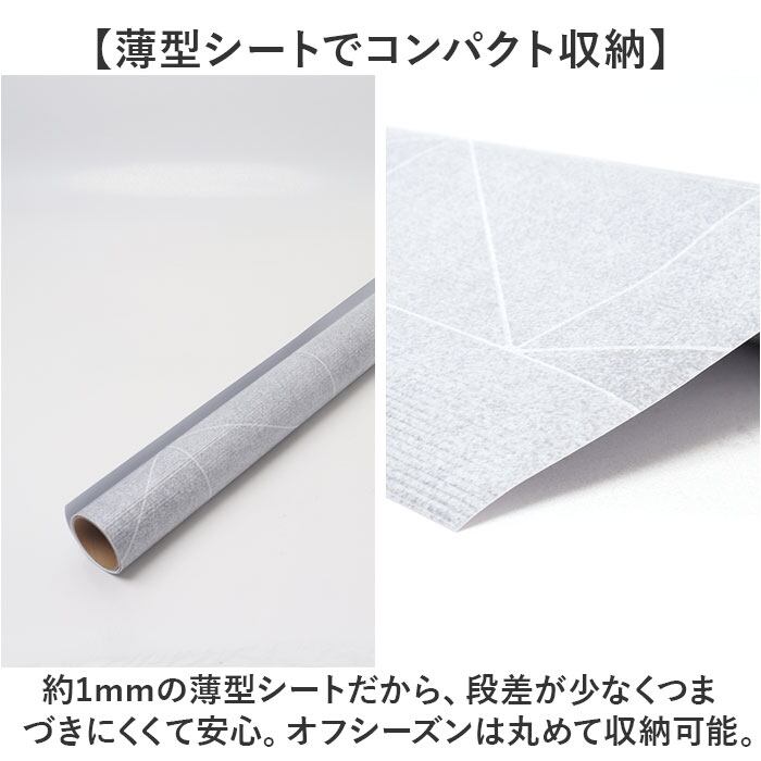 ・約1mmの薄型シートだから、段差が少なくつまづきにくくて安心。オフシーズンは丸めて収納可能。