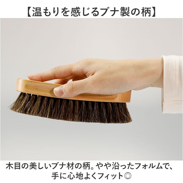 ・ブラシ部分は毛足の長い天然馬毛100%。毛の密度が高く、しっかりとブラッシング可能。