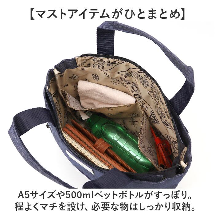 ・A5サイズや500mlペットボトルがすっぽり。程よくマチを設け、必要な物はしっかり収納。