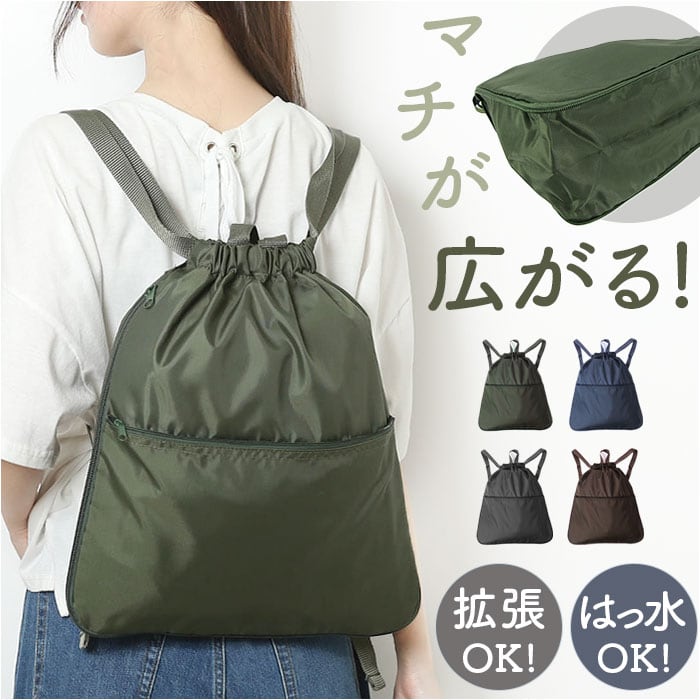 ・左右、底のファスナーを開くとマチが出現!荷物の量やシーンに合わせて簡単に調節ができる。