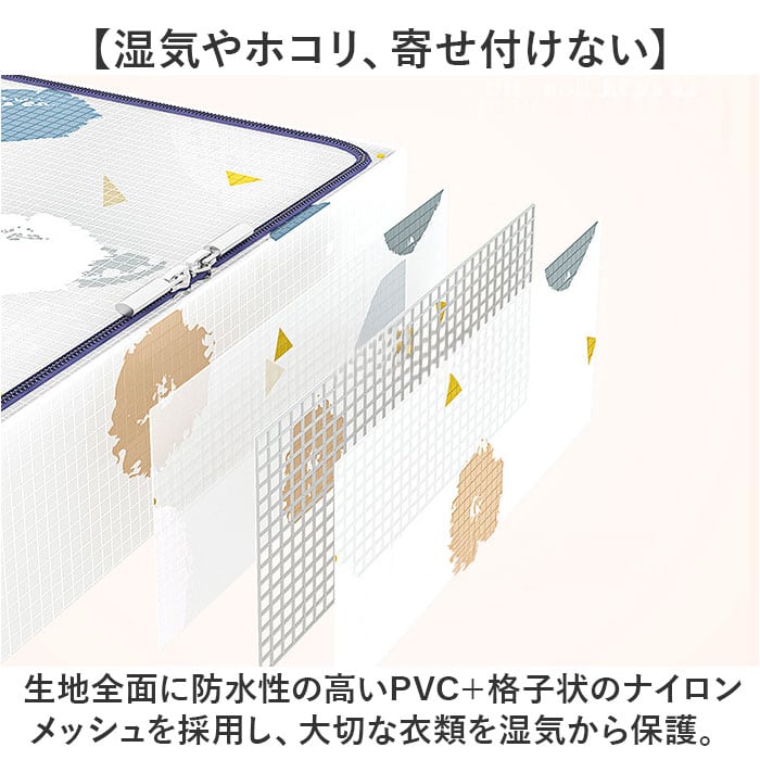 ・生地全面に防水性の高いPVC+格子状のナイロンメッシュを採用し、大切な衣類を湿気から保護。