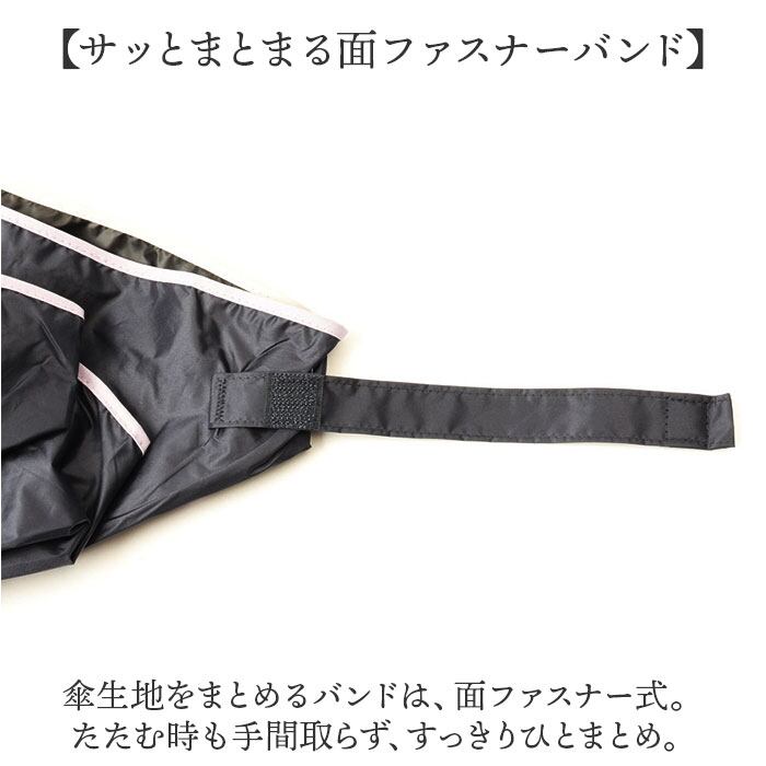 ・傘生地をまとめるバンドは、面ファスナー式。たたむ時も手間取らず、すっきりひとまとめ。