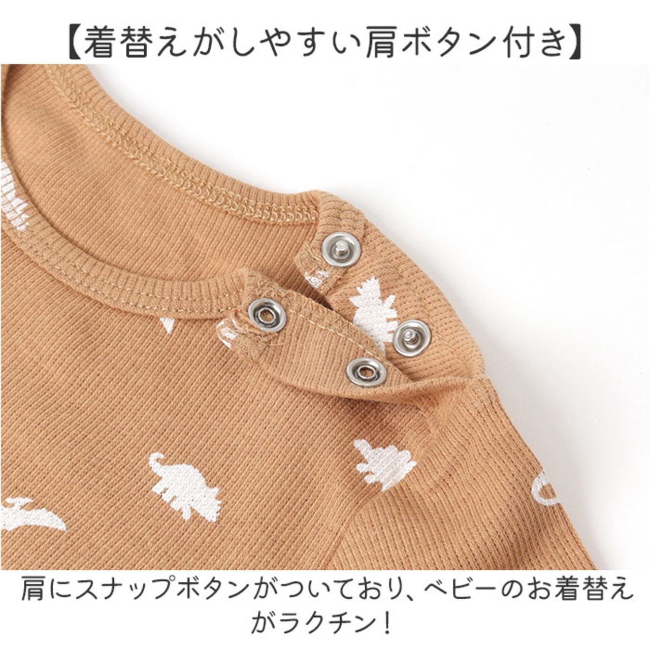 ・肩にスナップボタンがついており、ベビーのお着替えがラクチン!