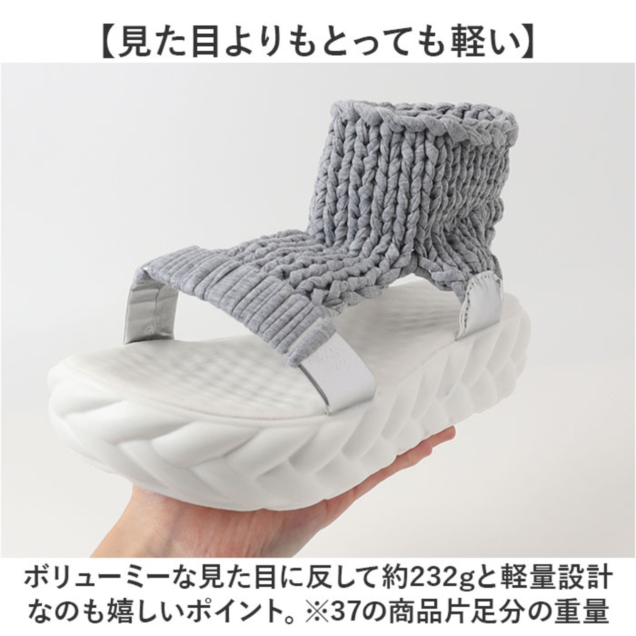 ・ボリューミーな見た目に反して約232gと軽量設計なのも嬉しいポイント。※37の商品片足分の重量