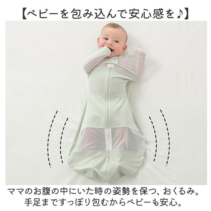 ・ママのお腹の中にいた時の姿勢を保つ、おくるみ。手足まですっぽり包むからベビーも安心。