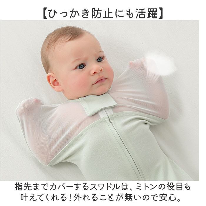 ・指先までカバーするスワドルは、ミトンの役目も叶えてくれる!外れることが無いので安心。
