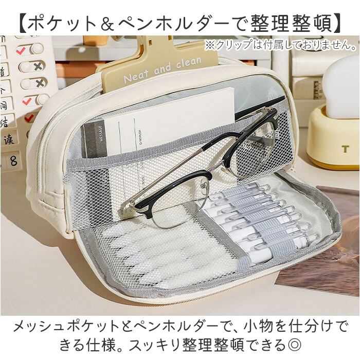 ・メッシュポケットとペンホルダーで、小物を仕分けできる仕様。スッキリ整理整頓できる◎
