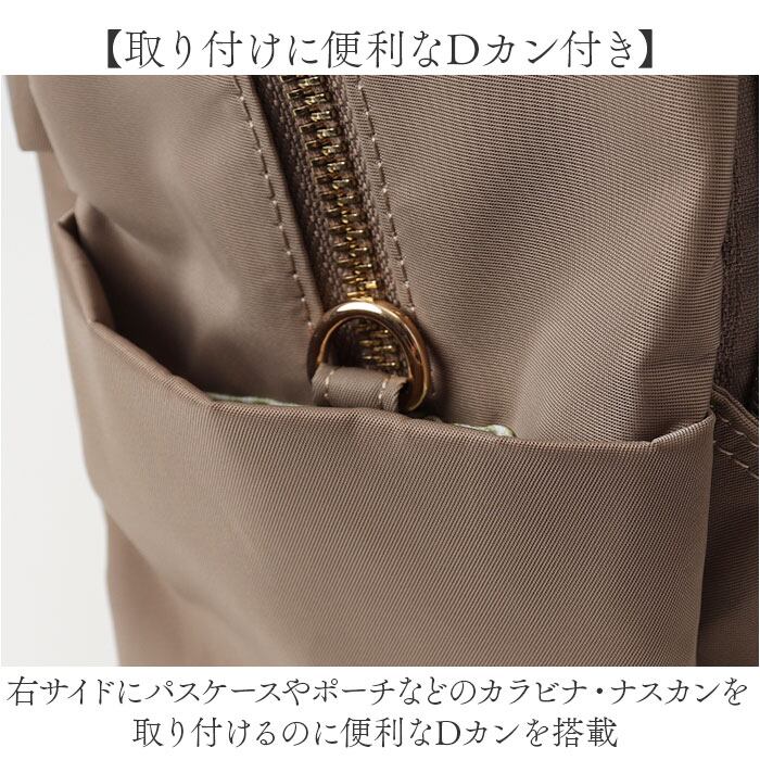 ・生地は丈夫で軽さが魅力的なナイロン素材を使用!ゴールドカラーの金具を使用し、カジュアル過ぎず上品さも。