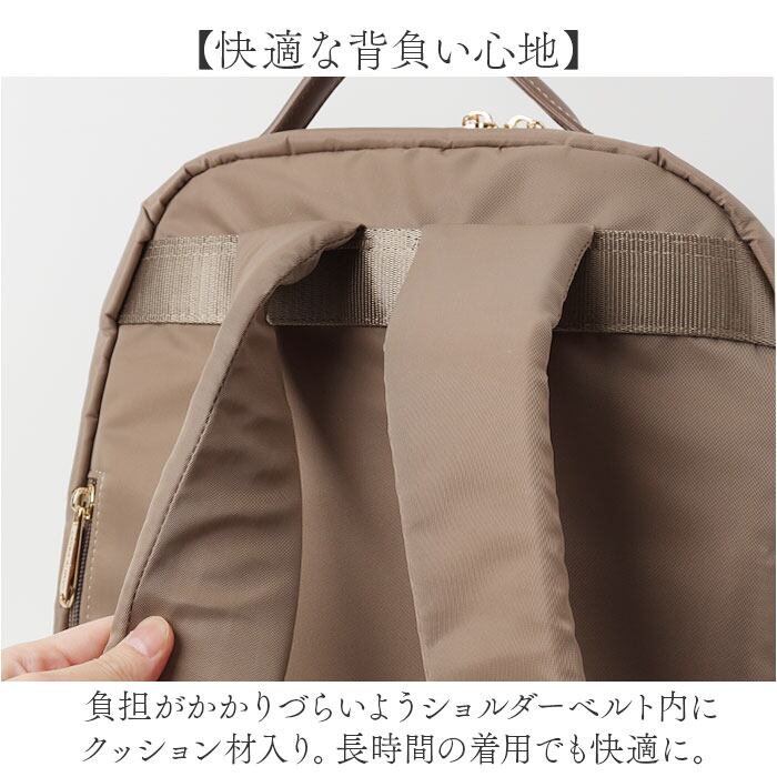・負担がかかりづらいようショルダーベルト内にクッション材入り。長時間の着用でも快適に。