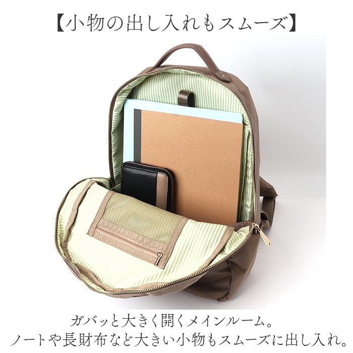・ガバッと大きく開くメインルーム。ノートや長財布など大きい小物もスムーズに出し入れ。