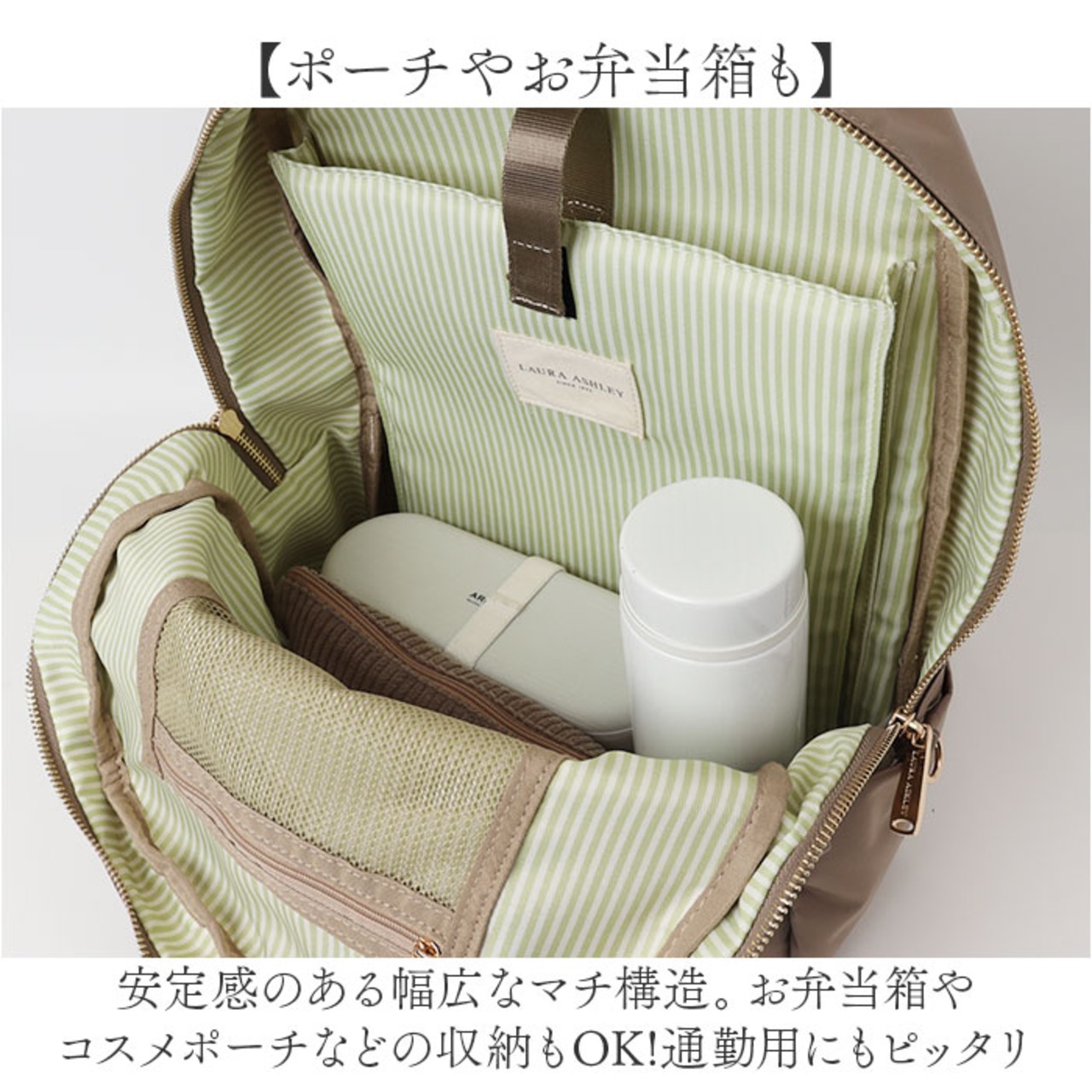 ・安定感のある幅広なマチ構造。お弁当箱やコスメポーチなどの収納もOK!通勤用にもピッタリ
