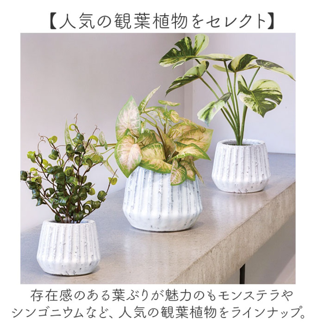 ・存在感のある葉ぶりが魅力のもモンステラやシンゴニウムなど、人気の観葉植物をラインナップ。